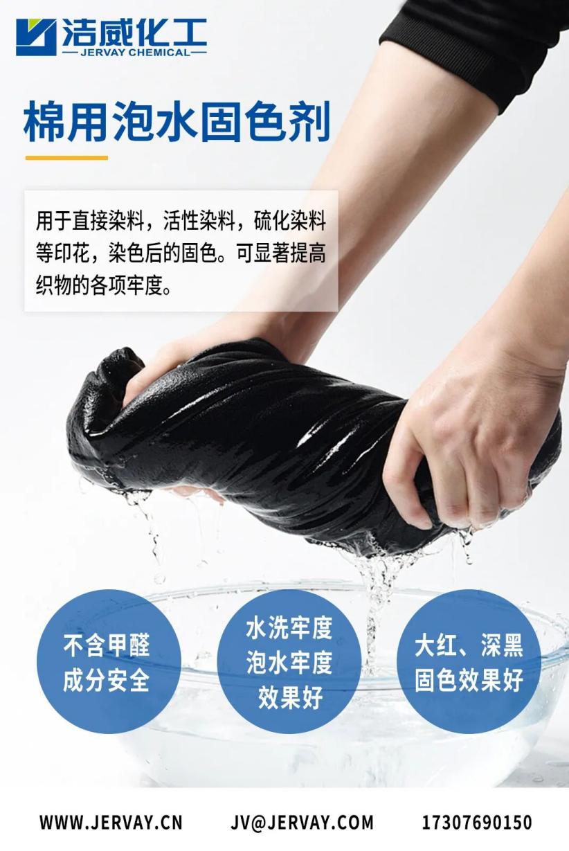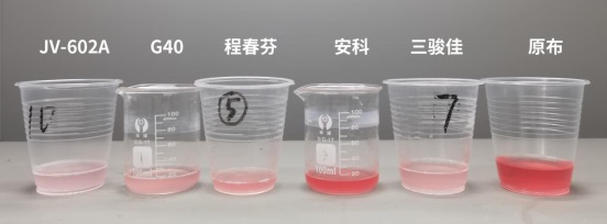 我司的无醛固色剂(棉用泡水固色剂)JV-602A的整体效果优于市面上的无醛固色剂,特别是在棉布固色上有较为明显效果,泡水牢度与皂洗牢度中表现优异。能赋予面料更高的价值,且对原样变色小,能较好保持原色的鲜艳度,是一款值得推荐的产品。